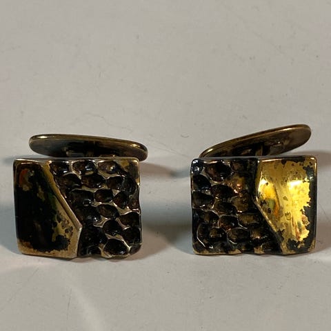 Flotte mansjettknapper i sølv og emalje på begge sider, med hyggelig sjømotiv med fjell og måker. Ser veldig fine ut, men har naturligvis noen overflateriper i emalje som jeg har forsøkt å ta bilde av. Det ser også ut til at det er gått et lite skår av den ytterste emaljen på den ene (se siste bilde), men ikke i selve fargen/motivet, så det er langt fra synlig ved vanlig bruk. Er sølvstemplet 925 S.