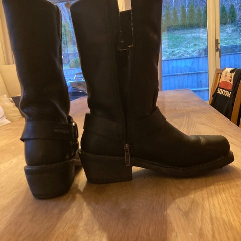 Harley-Davidson Motor Boots i svart skinn, herrestørrelse 44. Støvlene har en firkantet tå, spenne rundt ankelen og brodert logo på skaftet. Egnet for motorsykkelbruk og daglig bruk med slitesterkt materiale.