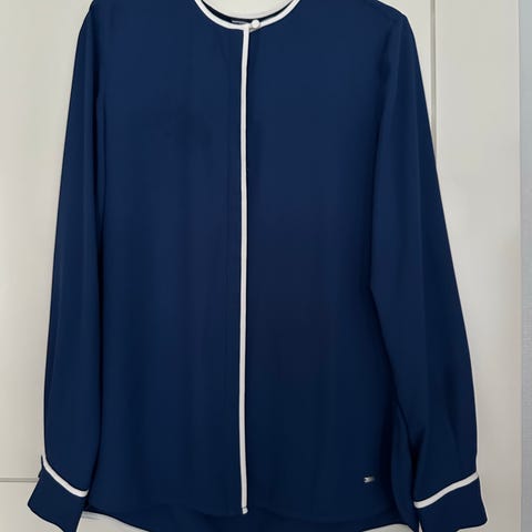 Marineblå bluse i str 36. Litt rynkete etter å ha hengt bakerst i skapet en stund. Men selges da den ikke passer meg. Nypris 899,-