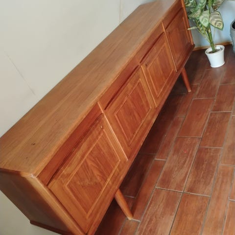 Pent brukt, selges grunnet salg av sommerhus. Nylig satt i garasjen hjemme (07.10). Enkelte flekker og riper (ikke mer enn det som synes på bildene), men blir nok ganske strøken med et strøk teakolje 🙂