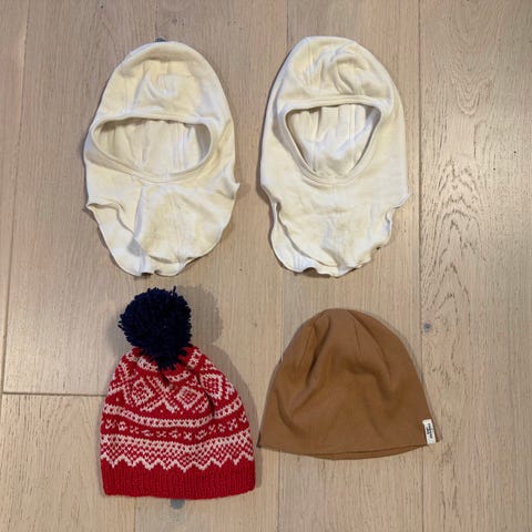 En liten vinterpakke, en grønn hals i ull som er helt ny og ubrukt (barnet nekta den), en rosa hjemmestrikka ullhals og 2 like balaclavaer med ører og uglemotiv.