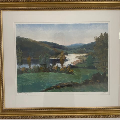 Landskap med fjell, trær og vann. 42x37 cm og er innrammet. Fargene i motivet inkluderer nyanser av blått, grønt, gult og brunt. Gullramme med noen få bruksmerker