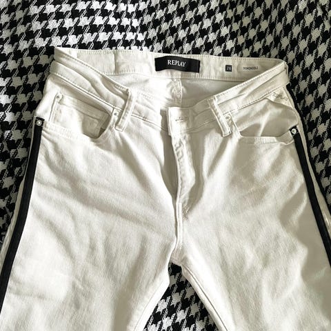 Replay slengbukser i kordfløyelstoff. W: 29. L: 34. Veldig fin, dyp grønnfarge. Vanskelig å få frem på bildene, da den ser lysere ut i direkte sollys (se siste bilde). Svært lite brukt.