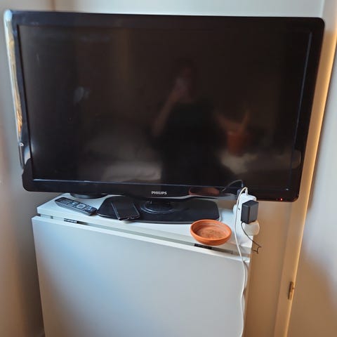 Philips TV med stor skjerm. Skjermen har synlige vertikale linjer som indikerer skjermskade. Produktet er egnet for reparasjon eller reservedeler.