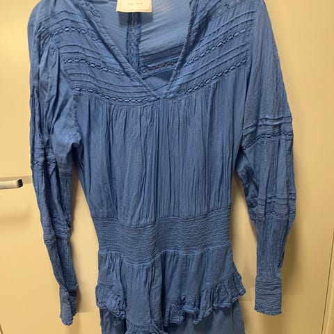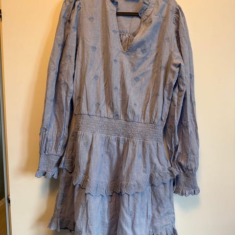 Neo Noir hverdagskjole i blå farge, størrelse 38 for kvinner. Kjolen har lange ermer og detaljer med rynking og broderi. Materialet er lett og har en myk tekstur, egnet for hverdagsbruk.