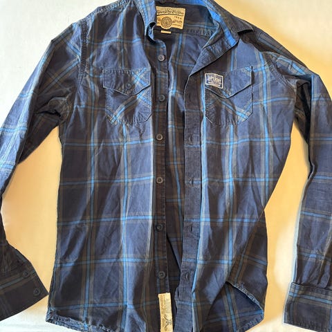 Superdry Vintage T-skjorte i blå farge, størrelse XL for herre. Laget av bomullsmateriale. T-skjorten har trykk på fronten med Superdry-logo og tekst i hvitt og oransje. Rund hals med kontrastfarget kant. Passer til hverdagsbruk.