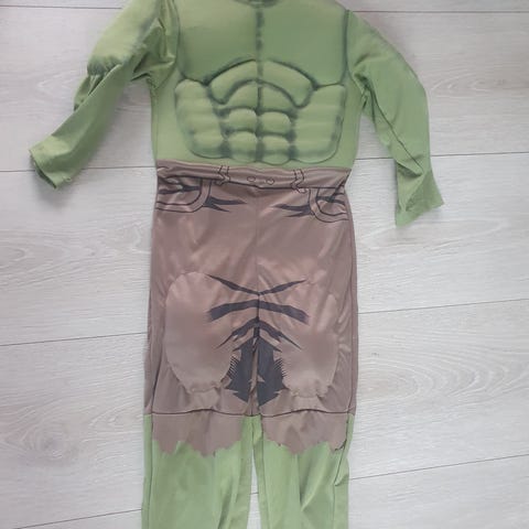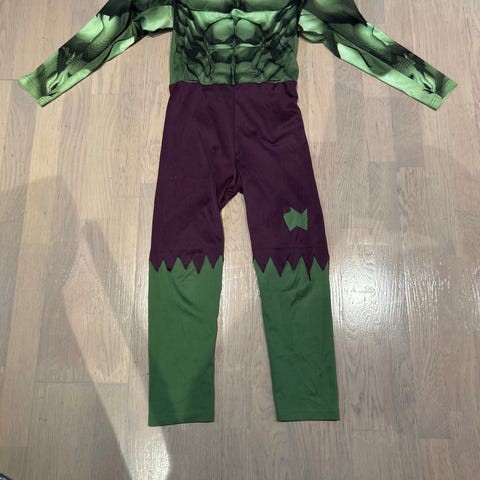 -116. Kostymet er grønt med detaljer som etterligner Hulk sin muskuløse overkropp og lilla bukser. Laget for barn og egnet til lek eller kostymebruk.
