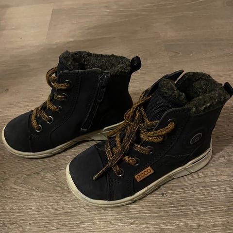 ECCO barnesko for gutt i størrelse 23. Skoene har snøring og glidelås i siden. Materialet er en kombinasjon av skinn og tekstil. Sålen er hvit med mønster for grep. Skoene er egnet for daglig bruk. Veldig fint brukte.