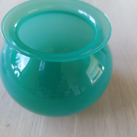 Vakker glasskule med luftbobler og innslag av rosa farget glass. Med slipt fot. Ca diameter er 9 cm. Vekt er 1124 gram. Hel og pen. Kan sendes med PostNord for kr 69,-.