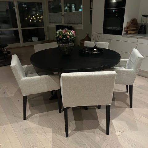 8 stoler av serien «Ella» selges. Dette er stødige stoler med god komfort! 6 stk uten armlener + 2 med armlener. En av stolene er litt vinglete, men dette kan enkelt stives opp. Noen av beina har skrapemerker i kantene.