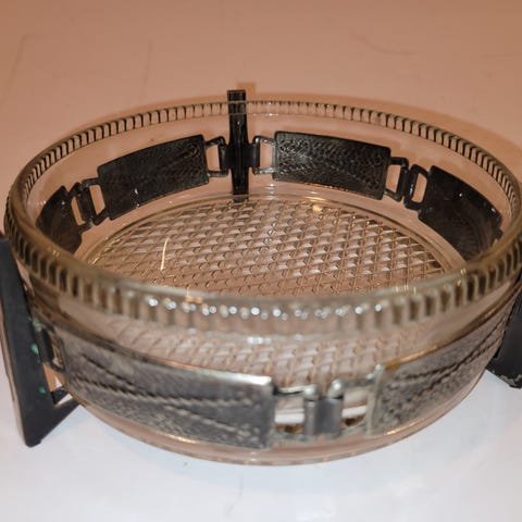 Vakker vintage bonbon dish / konfektskål i frostet glass med dekor i ekte rav og sterling sølv (925). Jeg vet ikke hvor mye sølv det er i vekt, da må man isåfall demontere den.