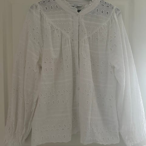 Vero Moda bluse i størrelse XS, hvit farge. Blusen har broderte blomstermønstre og knappestolpe foran. Kun brukt ved to anledninger og selges derfor videre