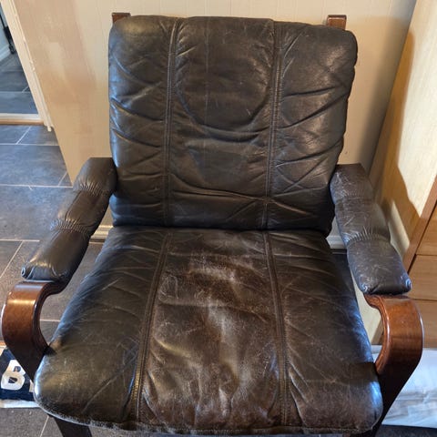 Skinnet på armlenene har slitasje og skinnet er noe krakelert. Fargen er noe ujevn pga. lyseksponering over tid.