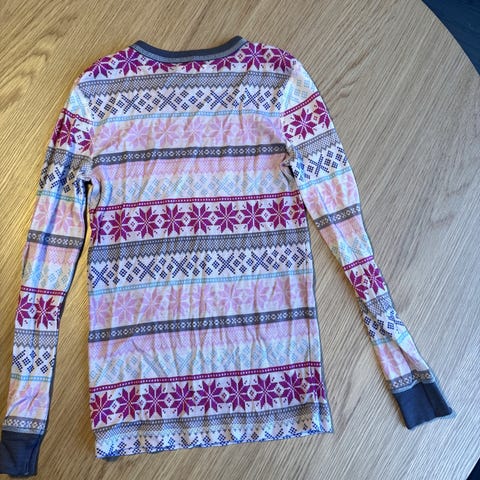 Reflex ullgenser for barn i størrelse 122/128. Genseren er rosa, hvit og grå med mønster, laget av 100% ull. Passer til bruk som varm og pustende mellomlag eller ytterlag ved kaldt vær.