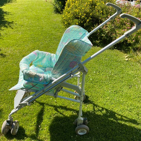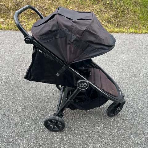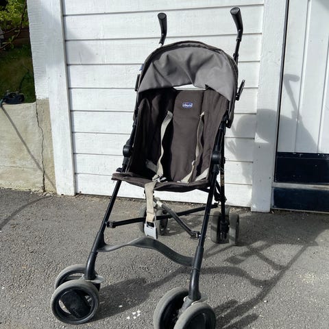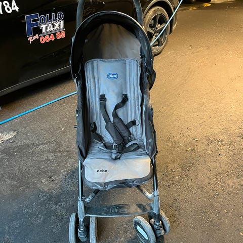 Var både sittende og liggende stilling, hette og sikkerhetsseler for barnet.
