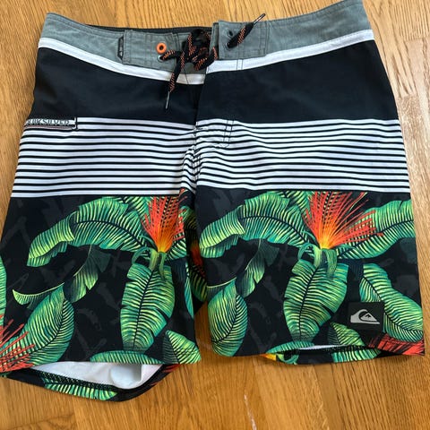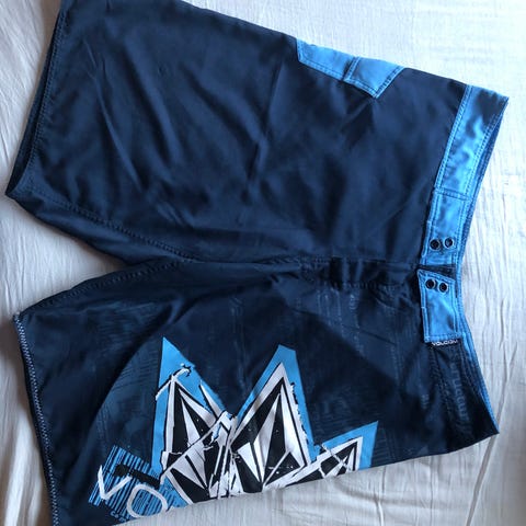 Quiksilver shorts for herre i størrelse 32, laget av 65% polyester og 35% viskose. Shortsene er blå med et rutete mønster og har flere lommer, inkludert baklommer med knapp og en lomme på siden. Passer til casual bruk.