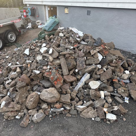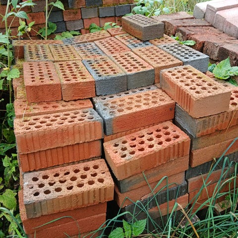 Ukjent merke murstein, 200 stk, rød farge. Egnet for bygging og reparasjonsarbeid. Steinene er stablet på pall og kan brukes til ulike konstruksjonsformål. 8 kr stykket
