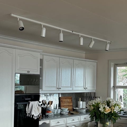 20 led i kvar pære, godt lys, warm white. Kan monterast på vegg eller i tak. Alle spot kan snuast rundt, og endre vinkel. Lampa kan og monteraat i vinkel ved eit hjørne. Total lengde 172cm