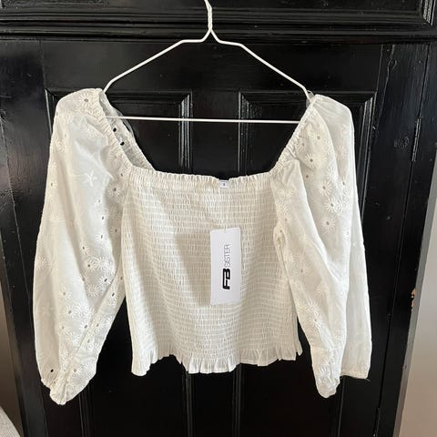 New Yorker bluse i hvit farge, størrelse S. Topp med strukturert stoff og puffede ermer med broderidetaljer, designet for kvinner. Kjøpt for 220kr. Pent brukt.