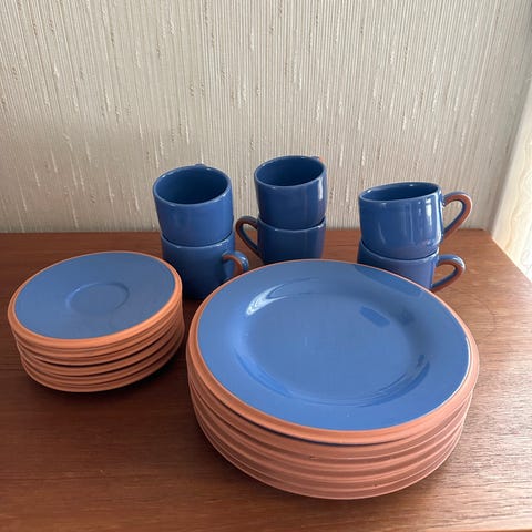 3 stk kaffekopper med skåler i keramikk. Kopper og skåler har blå blomsterdekor og blå kant. Passer til servering av kaffe og te og til å ha dessert i.