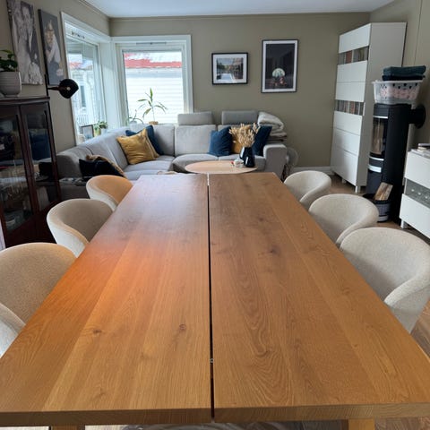 Spisebordet er pent brukt og har lite bruksmerker. Spisebordet kan utvides ved kjøp av ileggsplater