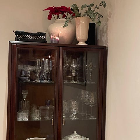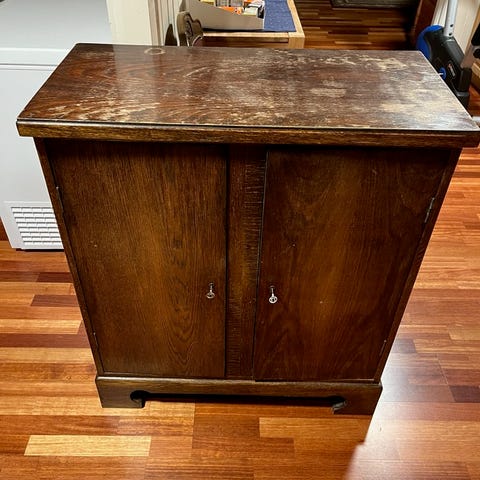Selger også skap som er 1/2 parten så stort og lav skjenk/bokhylle i en annen annonse