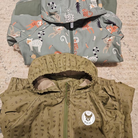 Liten klespakke med gult regntøy fra colorkids inkludert støvler fra Crocs og to fleece gensere fra Bergans. Pakken er brukt sammen en sesong. Av bruksmerker som kommer frem av bildene nevnes at den ene strikken under skoene på det ene buksebeinet er røket. Det er også en flekk i rompa på den gule buksen som ikke har noen praktisk betydning. Pakken selges samlet.