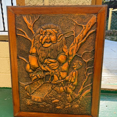Nesjane Suvenir og Brukskunst bronseveggdekorasjon med motiv av ett trolli skogen. Håndlaget i Norge, laget av bronse. Dekorasjonen er rektangulær og har en nostalgisk og tradisjonell stil.