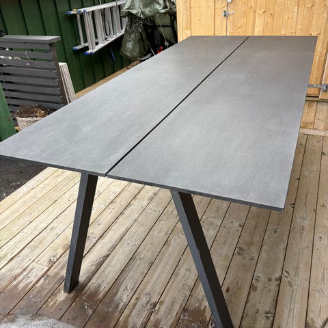 Rundt bord med grå overflate og diameter på 120 cm. Bordet har en ramme og ben i metall, og bordplaten er laget av tre. Passer til utendørsbruk. Bordet viser noe slitasje og en sprekk i bordplaten.
