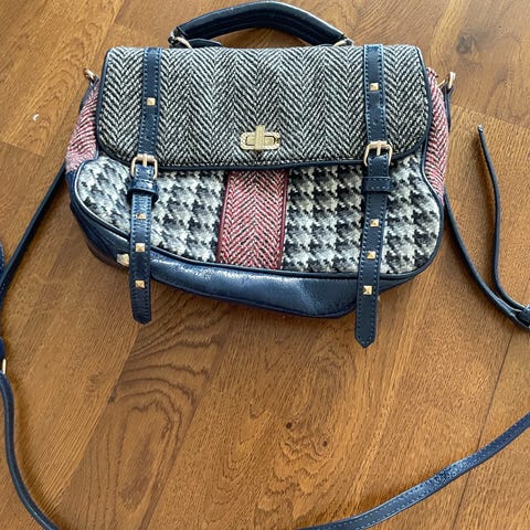 Denne er bare så lekker, men får rett og slett ikke brukt den nok! Ett stort rom med liten lomme med glidelås, samt et mindre rom foran. Superfint stoff inni! Synes knapt at den er bukt, men er noen lette skraper på låsen. Kan bæres i hånden i hempen oppå og på skulderen med reimen.
