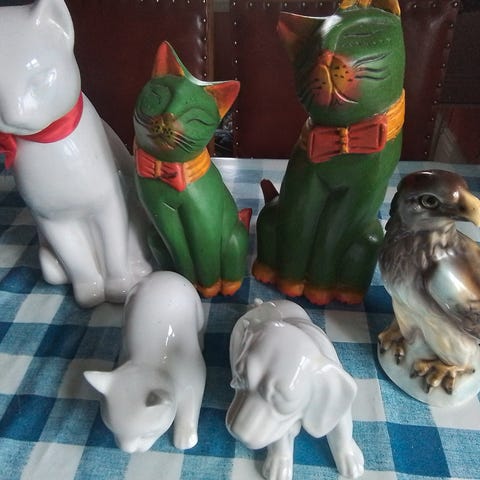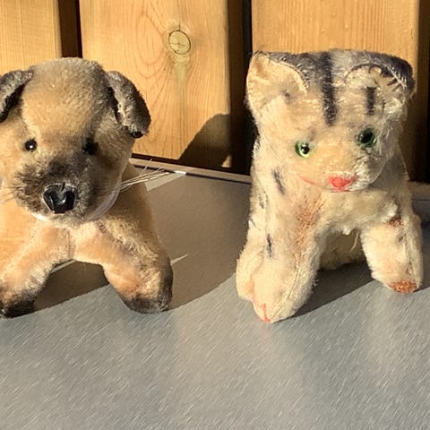 Hund, katt og røyskatt. Katten har et lite skår på øret ellers er de hele og fine.
