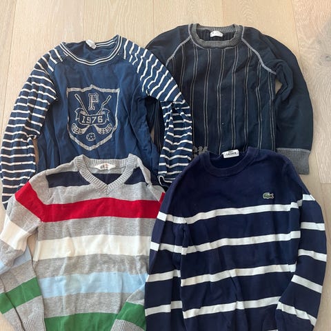 Name it Gutt genser i størrelse 122 -128 med flerfarget design. Fire gensere med ulike mønstre og farger, inkludert stripete, ensfarget blå, og gensere med mønstrete ermer. Laget for barn, egnet for daglig bruk.
