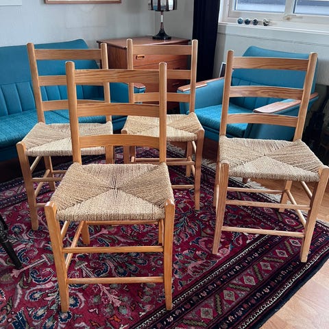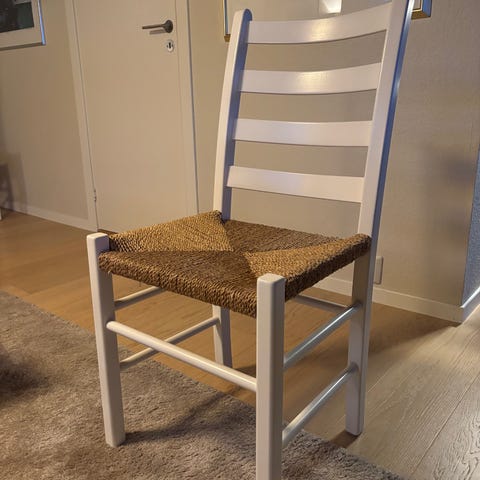 Dette er den opprinnelige Jærstolen fra Slåke Møbelfabrikk – ettertraktede nå som de ikke produseres lenger. Slåke Møbelfabrikk la ned driften, så dette er en sjelden anledning til å få tak i et større, matchende sett. Perfekt rundt langbordet, på hytta eller i spisestuen.