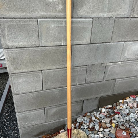 Fiskars spade med rødt blad og trehåndtak. Egnet for hagearbeid og graving. Laget av holdbare materialer for langvarig bruk.