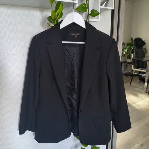 KappAhl Blazer i svart farge, damemodell i størrelse 42. Jakken har en klassisk design med en knappelukking foran og er laget i et materiale som gir en pen og formell passform. Brukt 1 gang.