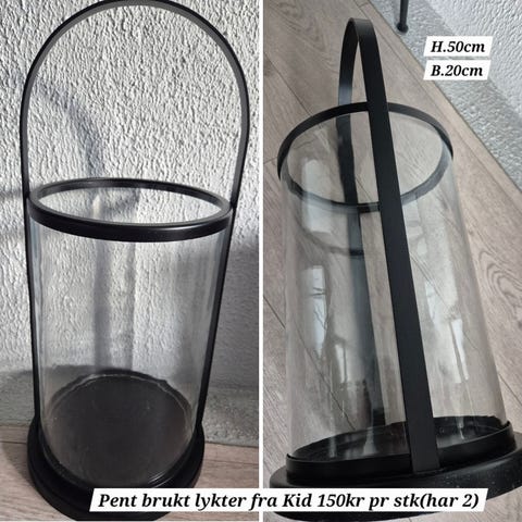 2 stk. lykter fra kid med brune skinn detaljer. Største lykten er 33 cm i diameter og 55 cm høy. Den minste 23 cm i diameter og 45 cm høy.