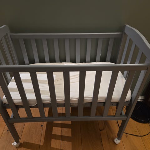 I grå tone i grått tre. Designet for å sikre barn under søvn eller hvile. Passer til små barn og kan brukes i hjemmet for trygg soveplass.