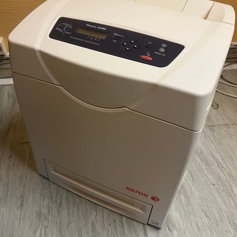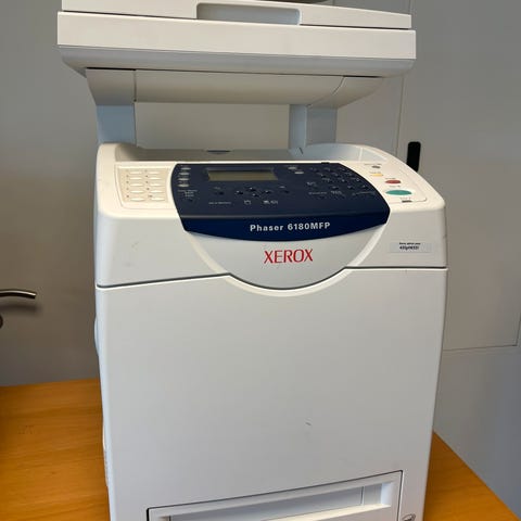 Xerox Phaser 8550 laserprinter med funksjoner som høy utskriftskvalitet og pålitelig ytelse. Enheten har et kontrollpanel med display og flere betjeningsknapper. Passer for kontorbruk med behov for svart-hvitt og fargeutskrifter.