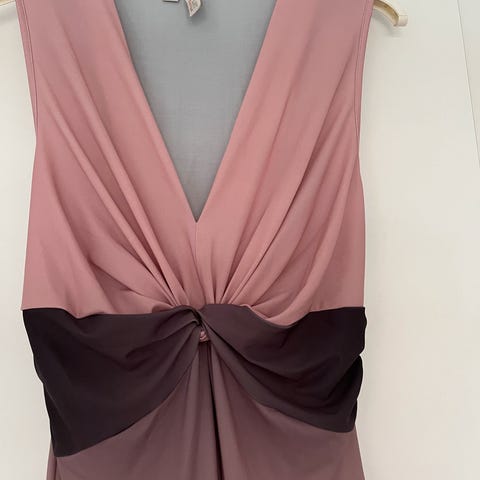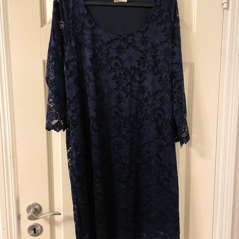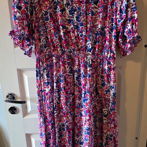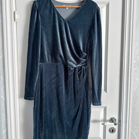 Ubrukt kjole i blått og grønt str. L. Kjolen er lang, med v-hals, vide ermer og et slagd belte i livet. Bak på ryggen er det strikk livet som gjør at kjolen sitter superfint på. På bildet fra nett ser kjolen mer grønn ut, men vil si hovedfargen er blå.