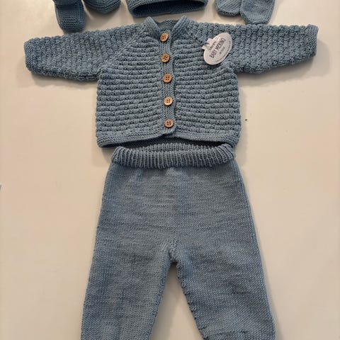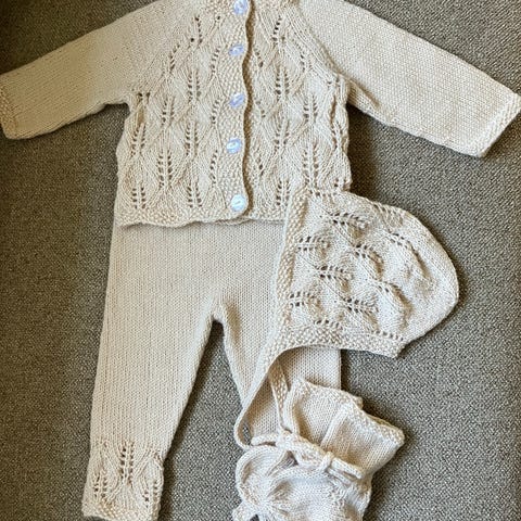 Søtt hentesett i hvitt ( offwhite ) ca 0-3 mndr. Håndstrikket i ull.
