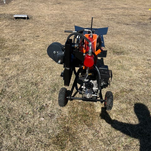 Montert på hjul med standard kulekobling kan maskinen enkelt kobles tilbil eller atv for å fraktes rundt.