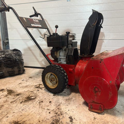Snapper 10/30 snøfreser med 10 hestekrefters motor. Rød farge, robust konstruksjon for effektiv snørydding. Utstyrt med store hjul for godt grep på snødekte underlag. Egnet for privat bruk i områder med moderat til kraftig snøfall.