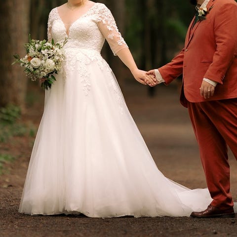 Kjolen er i størrelse 46, men som med de fleste brudekjoler er størrelsen litt annerledes enn vanlige butikkstørrelser. Og den passer overraskende ulike kroppsfassonger (selger bilder av tre forskjellige som har prøvd kjolen)