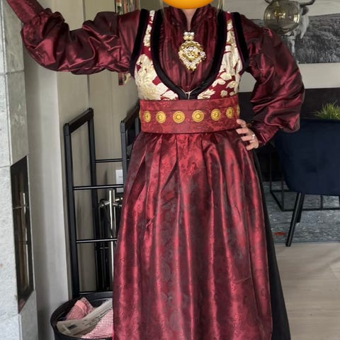 Dette er hjemmesydd festdrakt m/ diverse mønster og materialer plukket og satt sammen til en oppdiktet drakt fra meg. Fint sydd også enn god del handsøm.