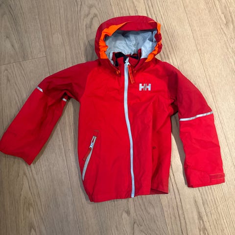 Helly Hansen barnejakke i størrelse 122, unisex. Jakken er grønn med hette og har refleksdetaljer for økt synlighet. Den er laget av vanntett materiale og har en fôret innsiden for komfort og beskyttelse mot vær og vind.
