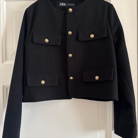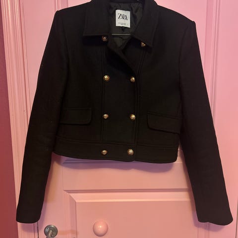Selger en nydelig kort kåpe fra Zara i en dyp blåfarge.
