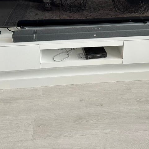 Pent brukt hvit TV-benk med glassdører