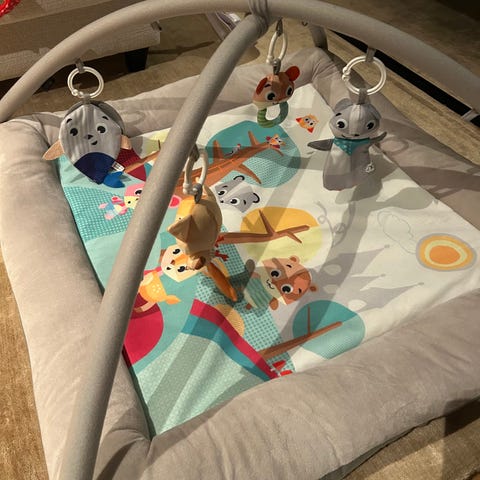 Den ene hengeleken har et mykt speil på ene siden, speilet er synlig brukt/klemt på. Ellers er babygymmen i veldig god stand.
