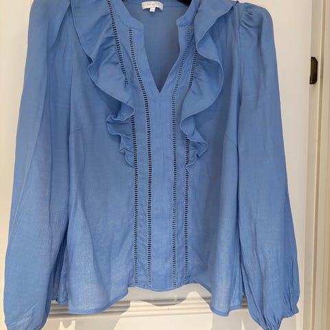 Mango MNG kongeblå bluse, størrelse M. Blusen har lange ermer og volangdetaljer på front og skuldre.