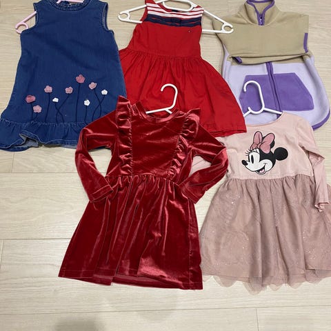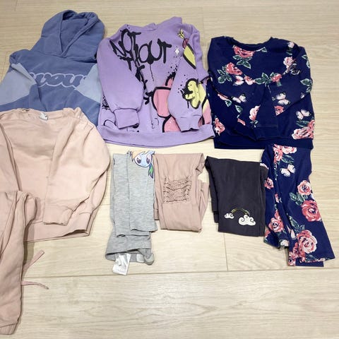 Det er forskjellige stykker av barneklær. Alt er helt og godt. Noen er gode som nye. Jeans, regndress, lysrosa kjole, skinnjakke var sjelden tatt på, så de er i nesten ny stand. Resten er i god nok stand. Den fine kjolen er ikke for å ha på på en fest,med for å leke prinsesse hjemme,den er synlig brukt. Størrelsene er forskjellige men alle stykkene er for en tynn jente fra 5 til 7 år, som er ca 110 cm.